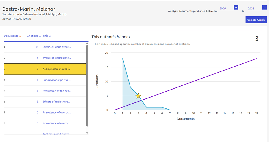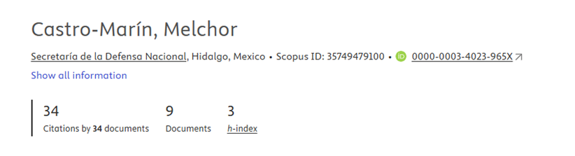 El doctor Melchor Castro-Marín cuenta con perfil de autor en Scopus. Tienen nueve documentos con 34 citas recibidas a 9 documentos de su autoría incluidos en esta base de datos. Su índice H es de 3.