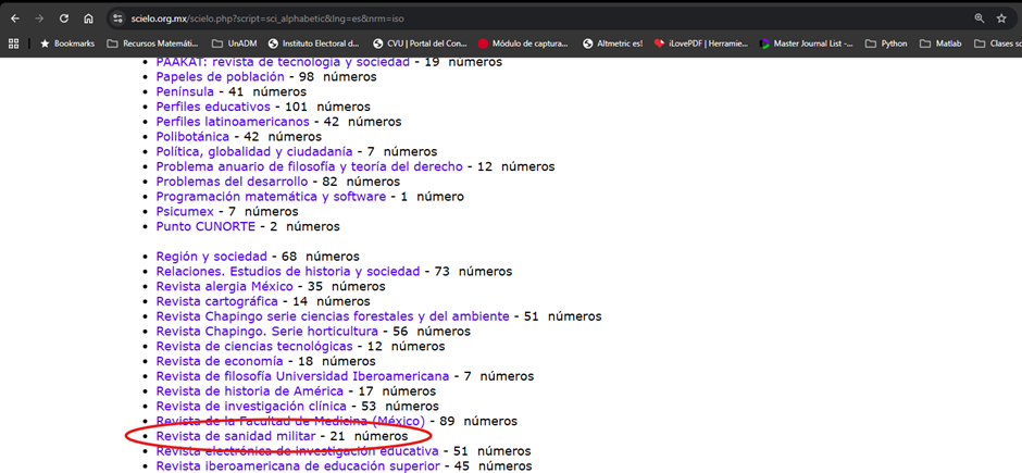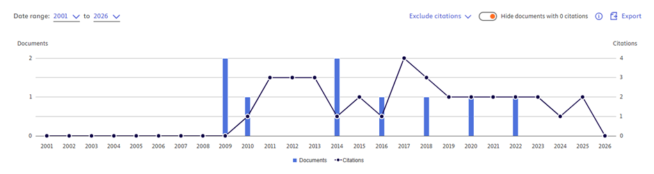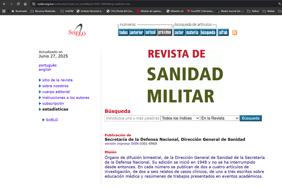 Aunque la revista aún no forma parte de bases de datos de carácter comprensivo, ya es posible identificar las citas que ha recibido en publicaciones incluidas en la colección Scopus. Esto permite dar seguimiento a los trabajos que hacen referencia a la Revista de Sanidad Militar.