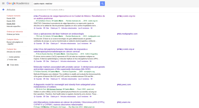 El Dr. Melchor Castro-Marín aún no cuenta con un perfil de autor en Google Scholar. Se reitera la recomendación realizada en años anteriores de gestionar dicho perfil, ya que se han identificado diversos artículos bajo su autoría. Con la creación y administración del perfil, sería posible obtener un reporte actualizado de citas y un índice H complementario al generado por Scopus, lo que fortalecería la visibilidad y el impacto académico de su producción científica.