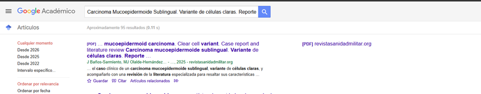La revista es cosechada por Google Scholar desde su sitio oficial. Cada que un nuevo número es publicado, los robots de búsqueda de Google cosechan la información de la revista de manera automática. El ejemplo de la imagen corresponde al artículo “Carcinoma Mucoepidermoide Sublingual. Variante de células claras. Reporte de caso y revisión de la literatura”, publicado en el Vol. 79 No. 4, que es el número más reciente de la revista.