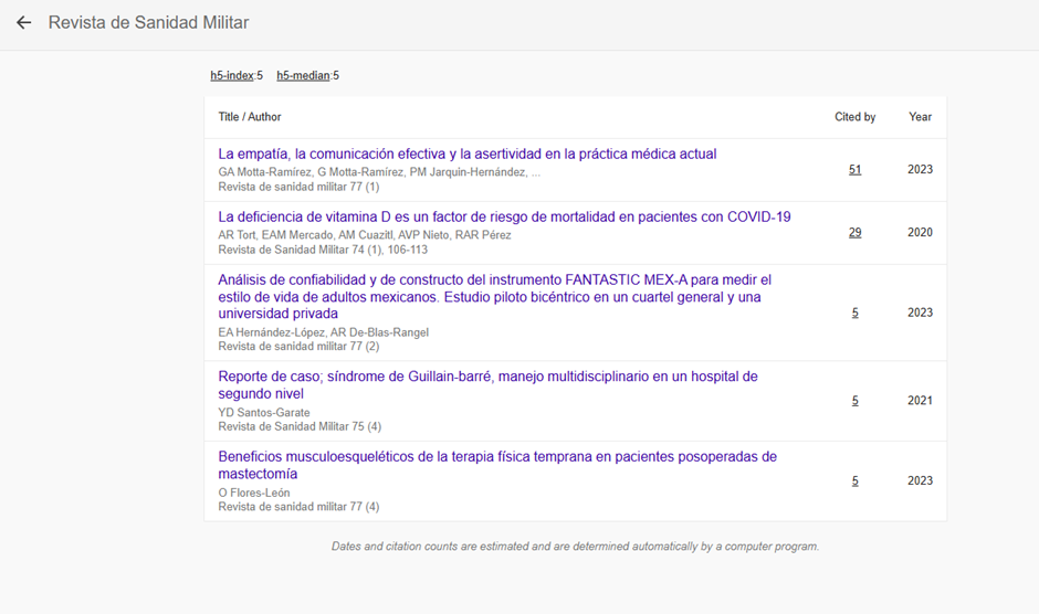 Google Scholar cosecha la información para las métricas del sitio institucional de la revista ((https://revistasanidadmilitar.org/index.php/rsm) y del sitio de la misma en SciELO México: (https://www.scielo.org.mx/scielo.php?script=sci_serial&pid=0301-696X&lng=es&nrm=iso)