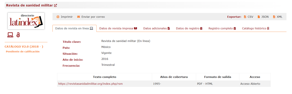 La revista aparece en el Directorio Latindex. No se ha evaluado para pertenecer al Catálogo V2. Los datos de identificación de la revista direccionan al sitio oficial.